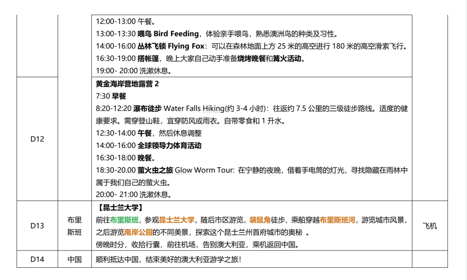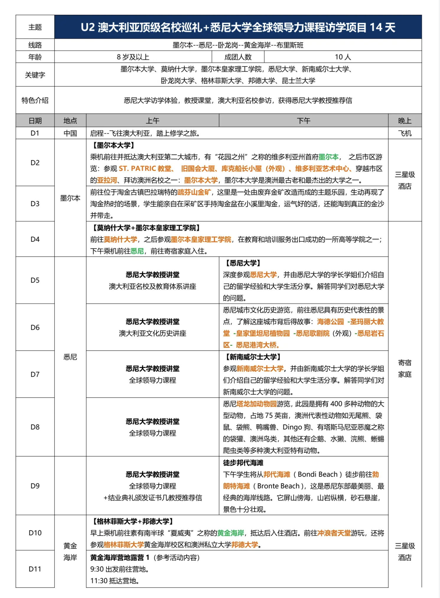 项目穿插疏芬山淘金、塔龙加动物园、邦代海滩徒步、黄金海岸营地露营与雨林探险等特色活动,体验南半球自然人文与名校学术氛围,助力学生提升全球胜任力。