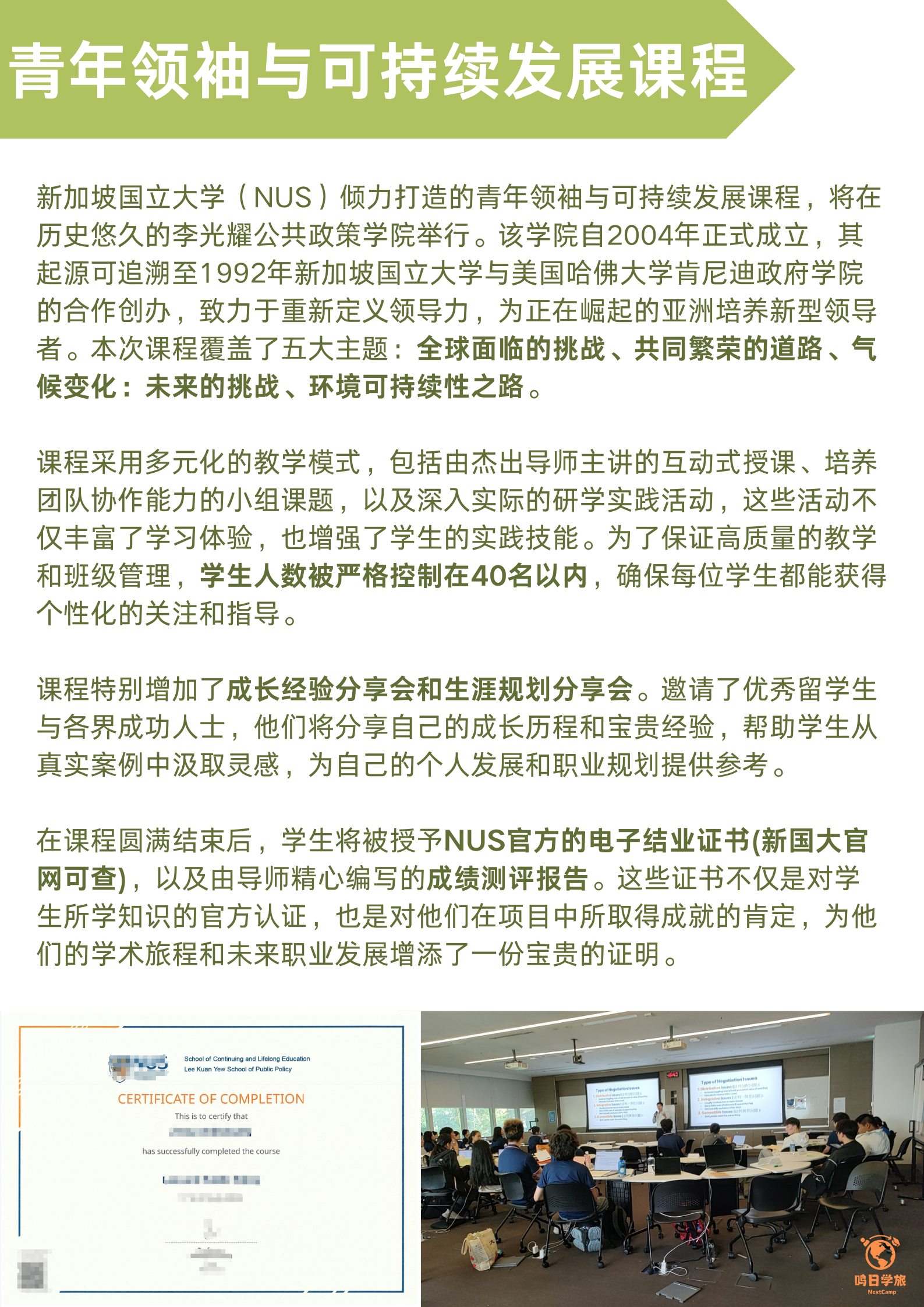 为确保学习质量和班级管理,每个班级最多40名学生,超过人数将按实际人数进行分班。 完成课程的同学将获得新国大官方项目电子结业证书+导师成绩测评报告。