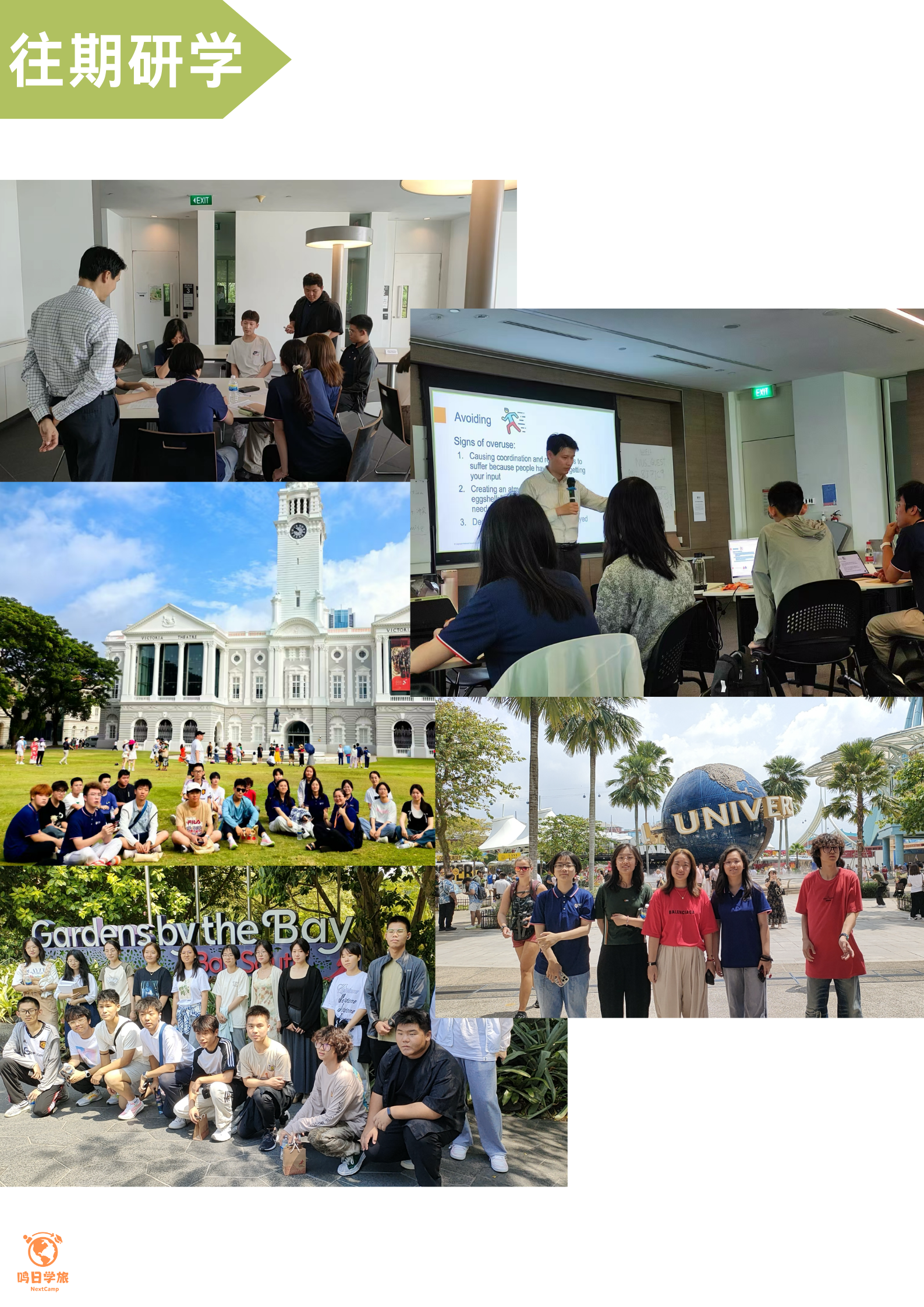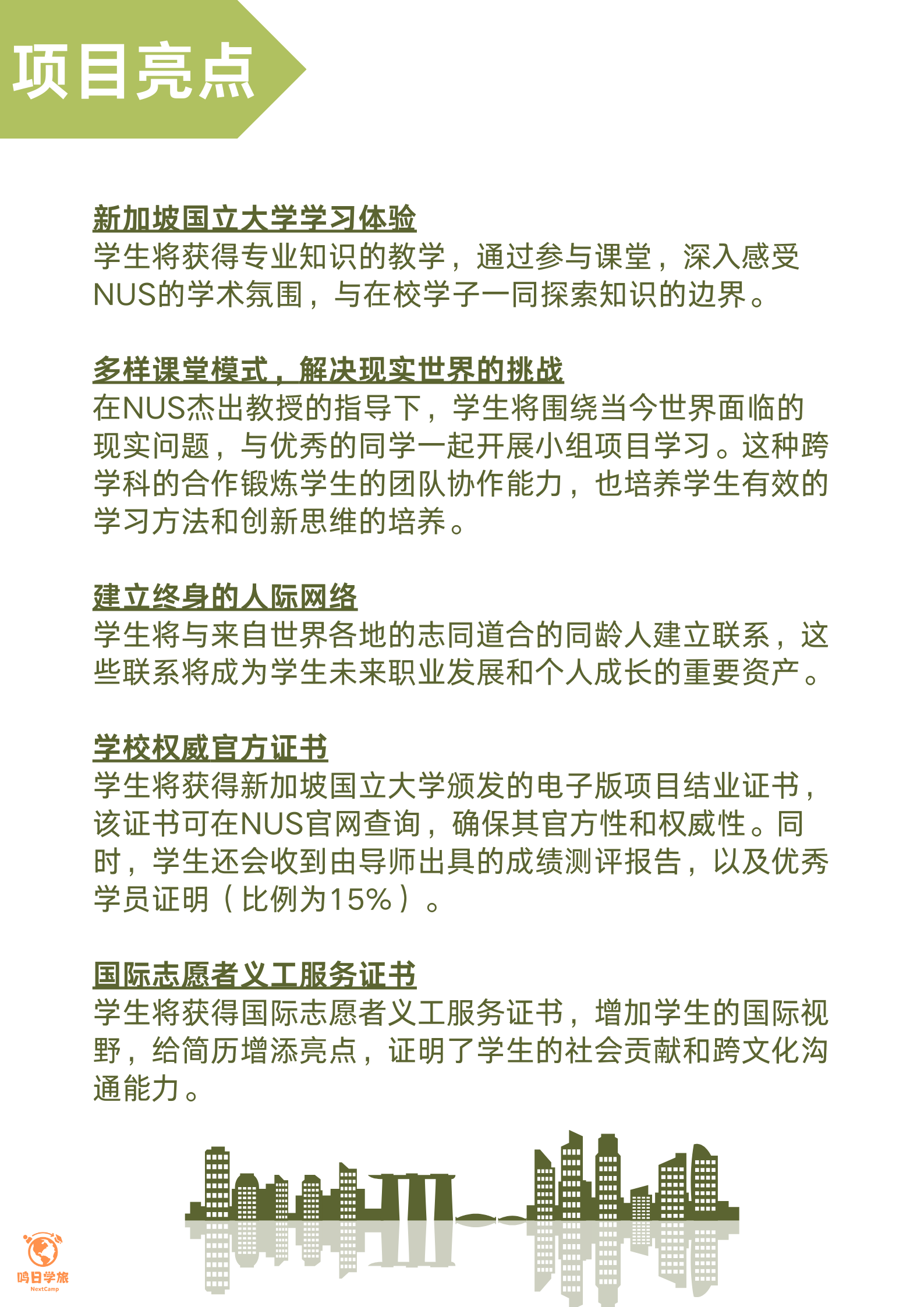 课程学习采用新国大杰出导师授课、分组讨论、小组课题以及相关丰富的研学实践活动等多种方式开展。 项目课题分为国际经济与金融、社区领袖和可持续发展、企业家精神、人文社科以及STEAM与未来科技等5大课程类别和18个不同的课程主题,从不同方面培养学生的综合能力。