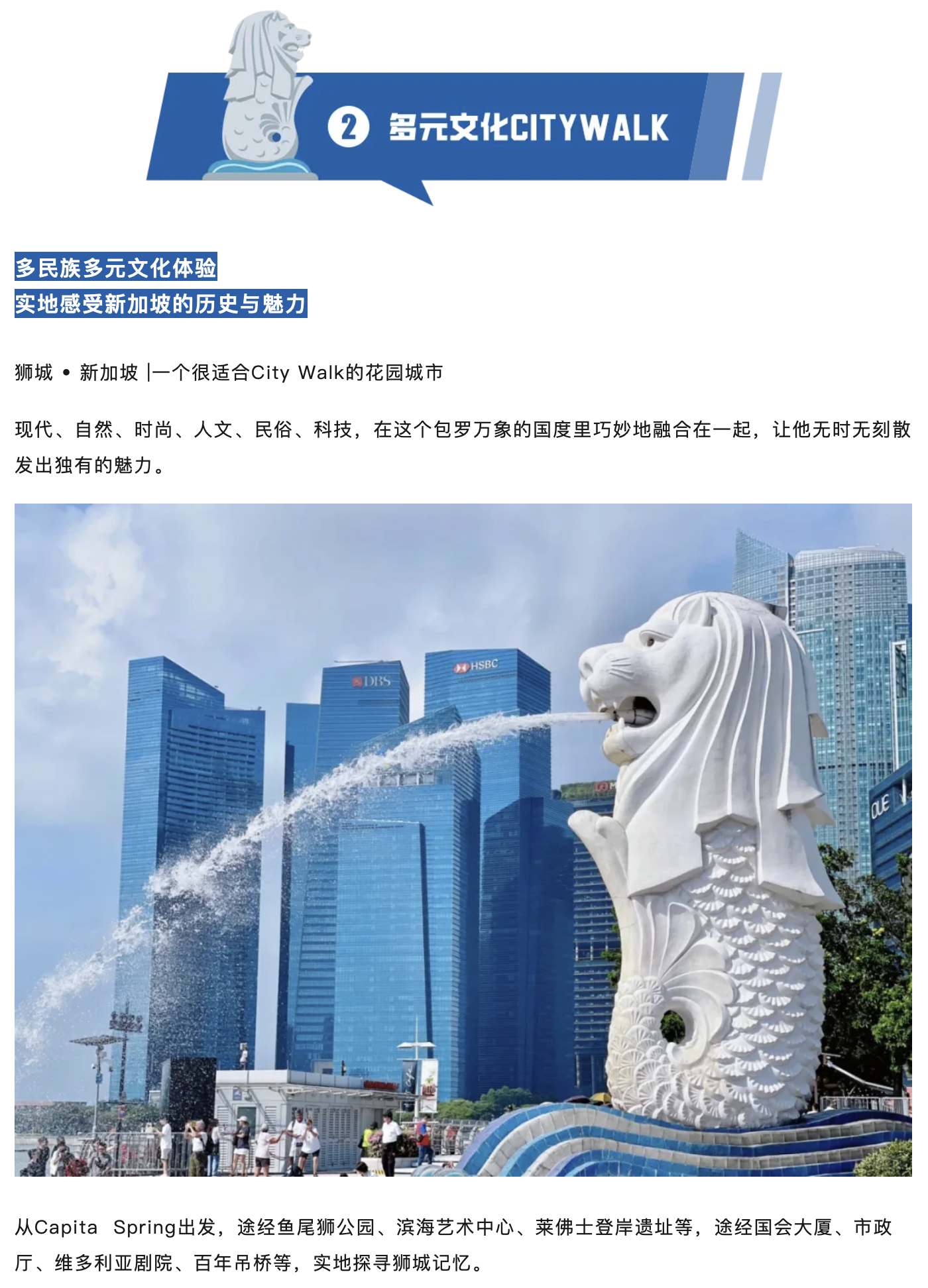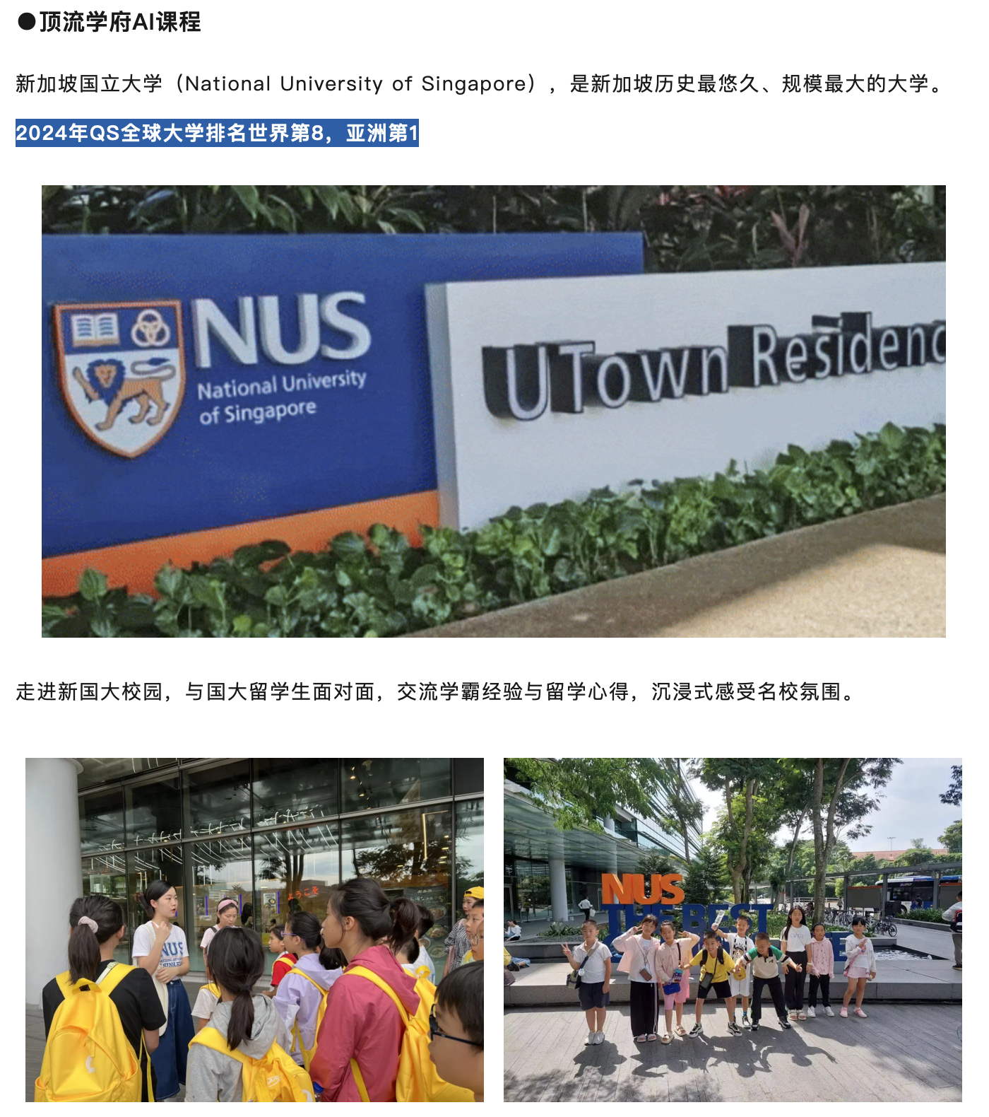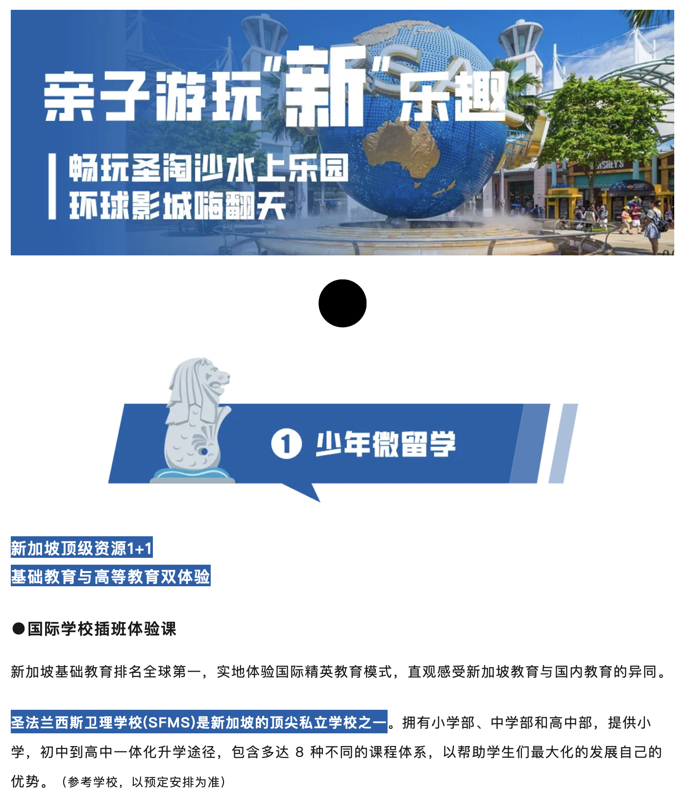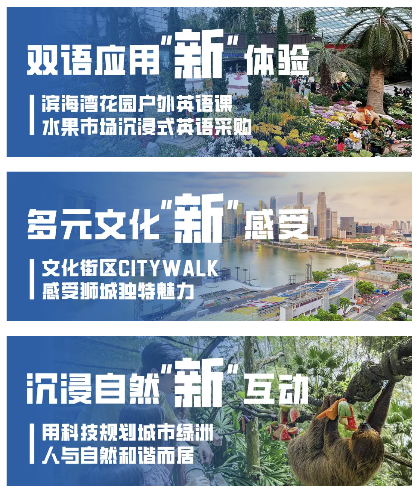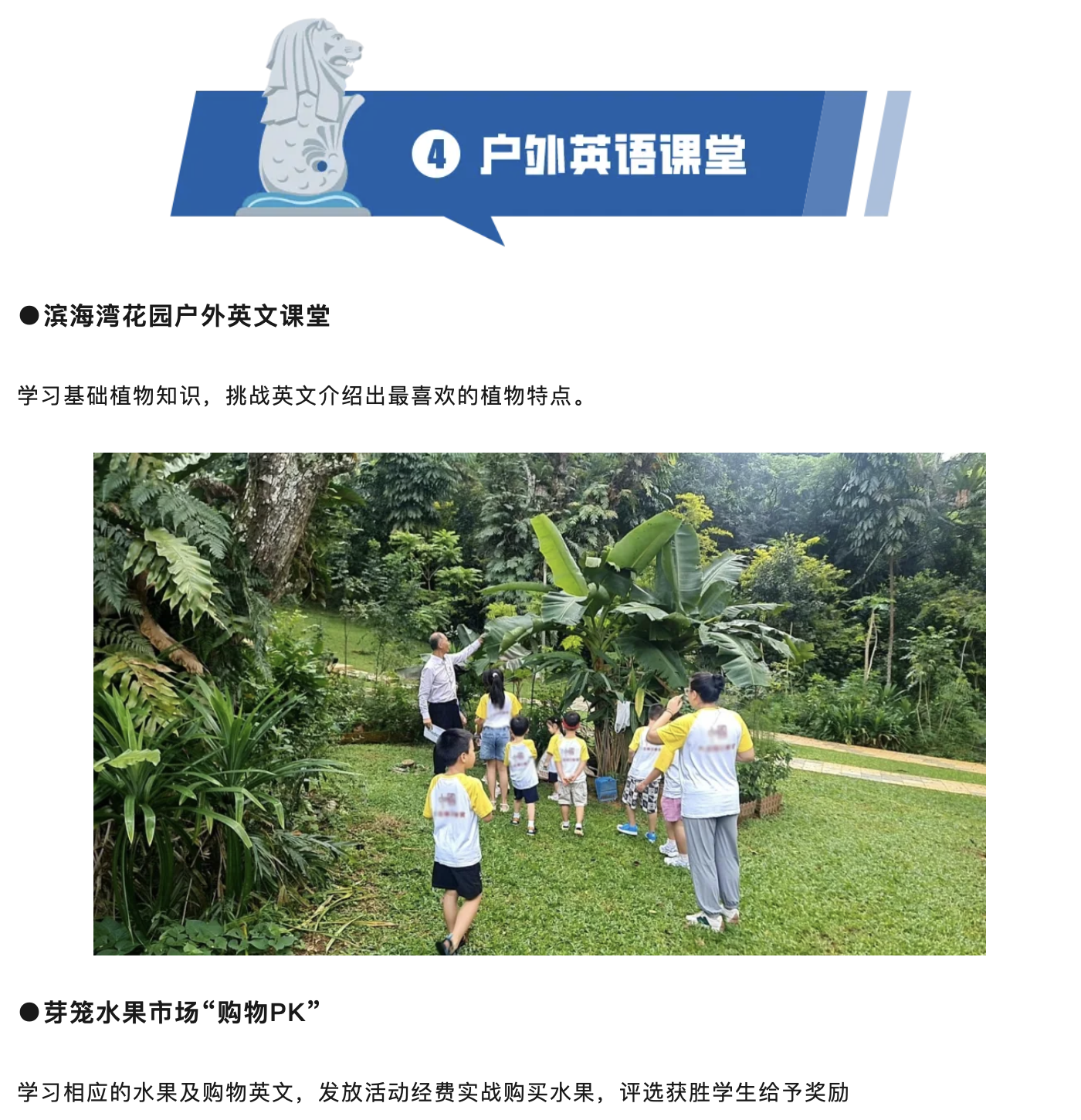 结合高品质亲子活动与自由探索,一次旅行,双重享受。 国际学校插班学习,体验新加坡国立大学尖端AI课程,收获AI未来学院证书和研学实践教育证书。 在滨海湾花园上户外英语课程,在水果市场体验沉浸式英语购物,让语言学习与生活实践完美结合。 Citywalk文化街区,深入感受狮城新加坡的多元文化魅力在圣淘沙水上乐园或在环球影城体验奇妙之旅,欢度家庭时光。